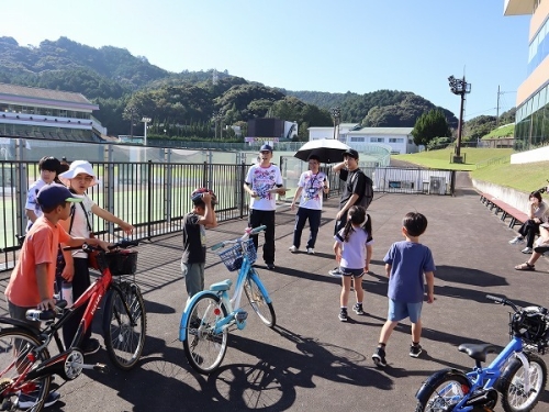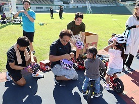①子供たちにヘルメットを着けてあげながら注意事項を説明する、原 司 選手