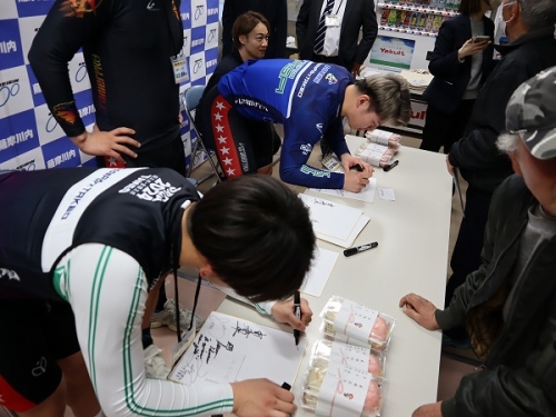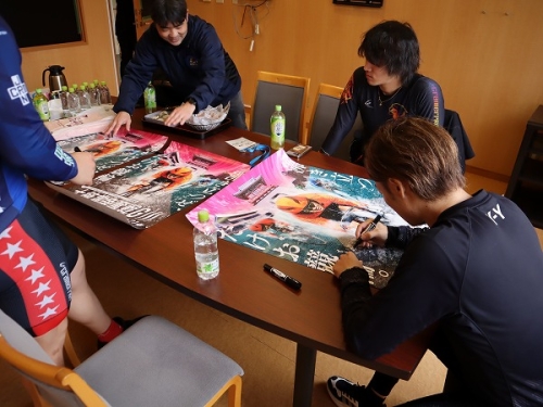 そして、今回のPRツアーの締めくくりに4月にたけお競輪場で開催されます開設76周年記念たけお競輪「大楠賞争奪戦」GⅢのポスターに参加選手たち全員でサインをして鹿児島県サテライト4場へのプレゼントです。