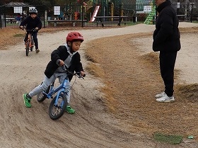 そして本日嬉しかったのは、1回目(10月)のバンク体験では補助輪付きの自転車で練習していたお子さんが、今日は補助輪なしでお父さんと一緒に熱心に自転車の練習していたお子さんが自転車に乗れるようになり最後は一人でスイスイバンクを走れるようになってました。