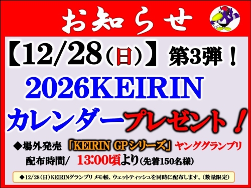 【武雄競輪場内ファンサービス】12/28(日)2026KEIRIRINカレンダー&KEIRINグランプリ粗品プレゼント!